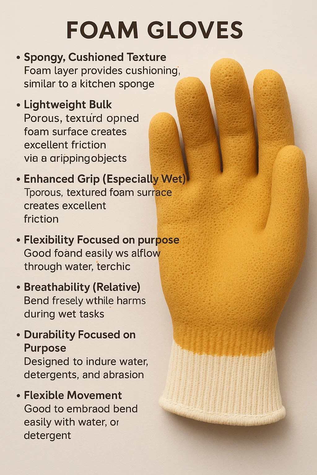 Foam gloves are defined by their unique material structure and functional traits. Here are their key characteristics: