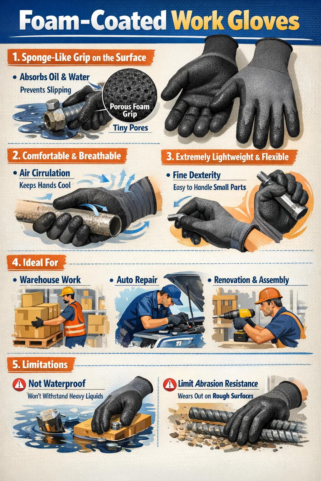 Foam gloves don't mean the entire glove is made of foam; rather, they refer to regular fabric gloves coated with a specially treated layer of rubber or polymer containing tiny pores.